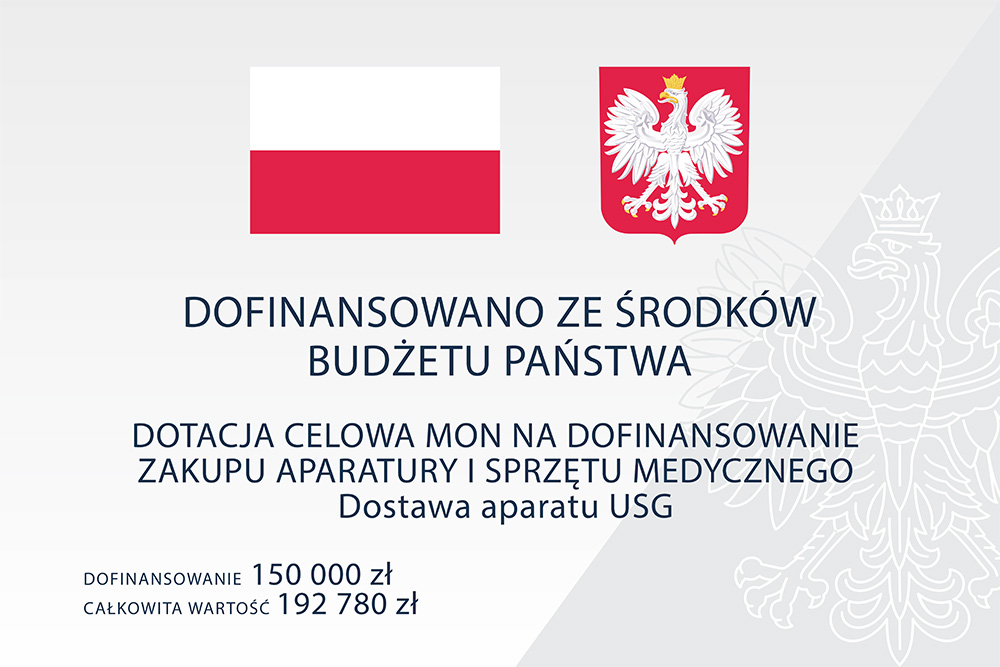 W ramach Planu Modernizacji Technicznej Sił Zbrojnych RP, przy udziale dotacji celowej z budżetu Ministerstwa Obrony Narodowej w roku 2021 WSPL SPZOZ w Grudziądzu zakupiła nowy aparat USG. Aparat z 3 głowicami użytkowany będzie głównie w poradni urologicznej a także w poradni chirurgicznej. Badanie pacjentów aparatem ultrasonograficznym nowszej generacji zdecydowanie poprawi jakość udzielanych świadczeń medycznych w zakresie diagnostyki urologicznej. Lepsza technika obrazowania pozwoli na dokładniejszą i trafniejszą diagnozę.